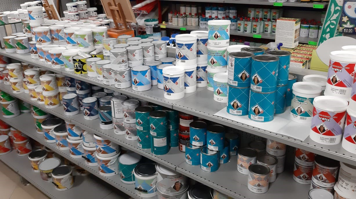 Pitture interni ed esterni, antimuffa, ai silossani, ai silicati, smalto a solvente, smalti all'acqua, vernici per legno, carta da parati, stucchi fibrati, pennelli, rulli, bordi autoadesivi, ecc